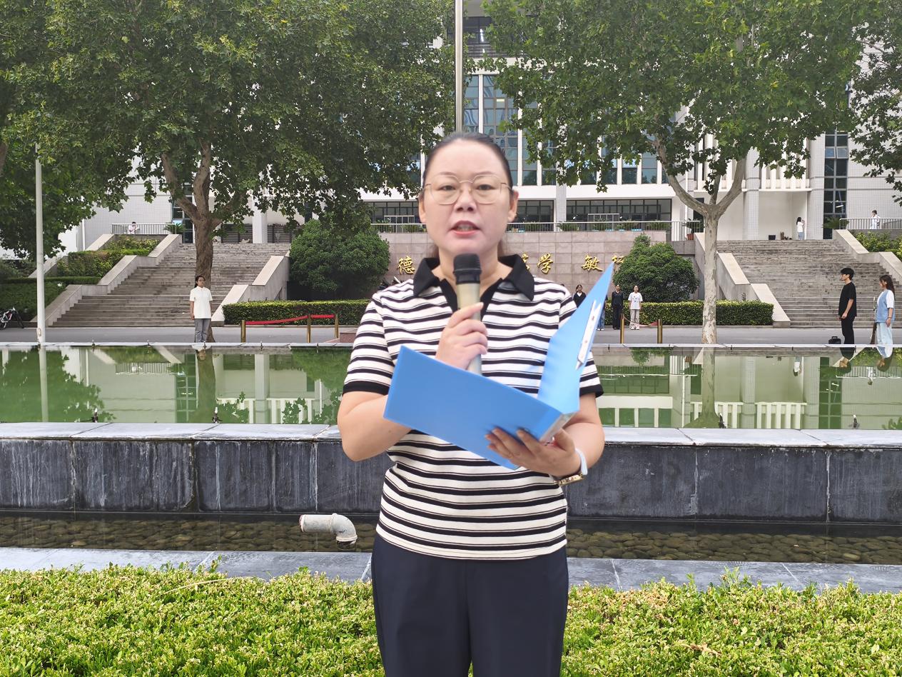 升旗仪式上,党总支书记路艳娜发表讲话。她指出,爱国首先要心里有“根”,这“根”是国家的历史,从先辈为民族独立浴血奋战到祖国走向富强,历史是推动我们前行的精神力量,我们要铭记历史,增强民族自豪感,将个人成长与国家发展紧密相连。同时,爱国更要手里有“本事”,作为大学生,要把书读好、把本领练扎实,在课堂专心致志、在图书馆潜心研读、在竞赛实践中全力以赴,以真才实学为爱国筑牢根基。此外,爱国还要脚下有“行动”,遵守校规校纪、尊敬师长、团结同学、参与志愿服务等,都是爱国的具体体现,大学生要将爱国热忱转化为日常行动,方能不负时代重任。